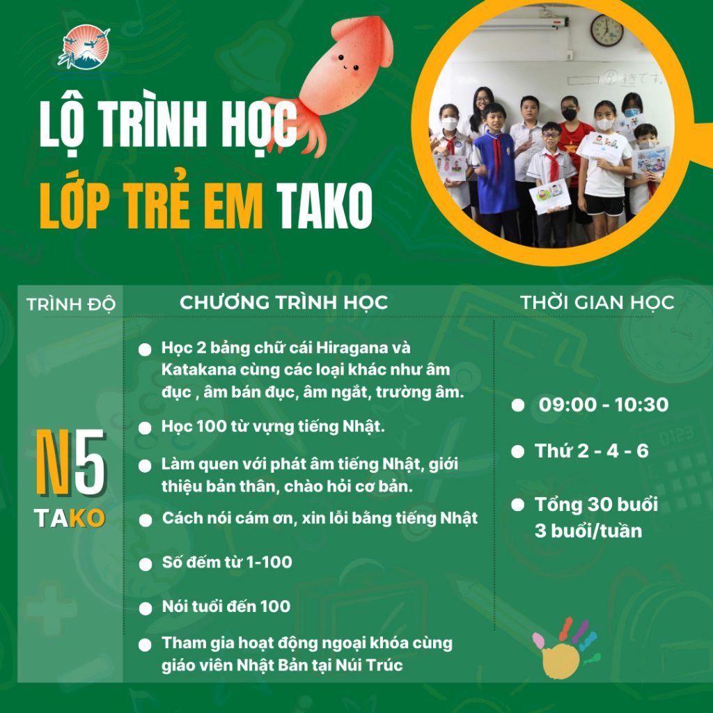 Thông báo khai giảng lớp học Tiếng Nhật cho trẻ em Tako - Ngày khai giảng: 05/06/2024 - Địa Điểm: Trung tâm tiếng Nhật Núi Trúc – Sugi Ryotaro - Số 15 Ngõ Núi Trúc, Kim Mã, Ba Đình, Hà Nội